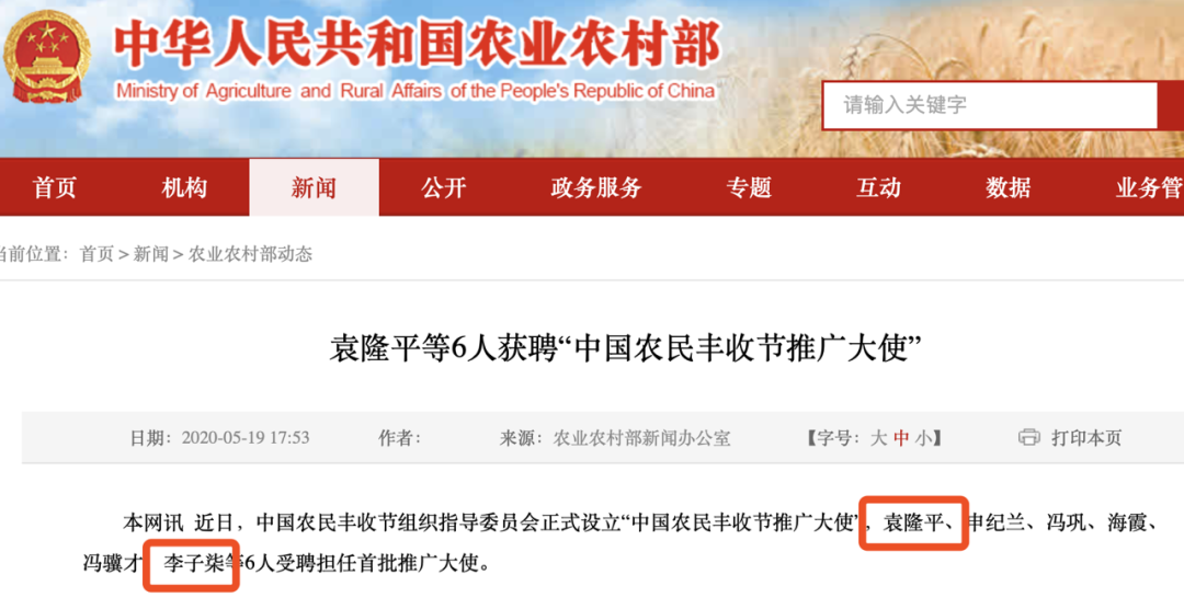来源 | 王耳朵先生(ID:huangezishiba) 大意是说中国农民丰收节组织指导委员会正式设立“中国农民丰收节推广大使”,受邀担任首批推广大使的有6个人。全国劳动模范申纪兰,相声演员冯巩,主持人海霞,学者冯骥才,水稻之父袁隆平,以及网红李子柒。官宣一出,评论区就爆了,网友纷纷祝贺这个90后女孩的付出与努力终于得到了肯定。